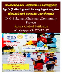 வெள்ளத்தால் பாதிக்கப்பட்டவர்களுக்கு ரோட்டரி கிளப் மூலம் உடனடி உதவி வழங்க விரும்புவோர் தொடர்பு கொள்ளவும் – Dr. G. Sukunan