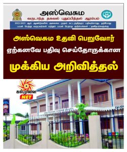 அஸ்வெசும உதவி பெறுவோர் ஏற்கனவே பதிவு செய்தோருக்கான முக்கிய அறிவித்தல்! அரசாங்கம் வழங்கும் அஸ்வெசும உதவித்திட்டத்தின் கீழ் 2022/2023 கணக்கெடுப்பின் கீழ பதிவு செய்யப்பட்டு நிவாரணம் பெறும் ...