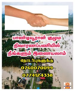 பாண்டியூரான் குழும நிவாரணப்பணியில் நீங்களும் இணையலாம்! நாட்டில் ஏற்பட்ட பாரிய இயற்கை அனர்த்தத்தால் மக்கள் பெரும் பாதிப்பை எதிர்கொண்டுள்ளனர். பாண்டியூரான் குழுமம் சார்பாக அனர்த்தத்தில் பாதிக்கப்பட்ட மக்களுக்காக ...