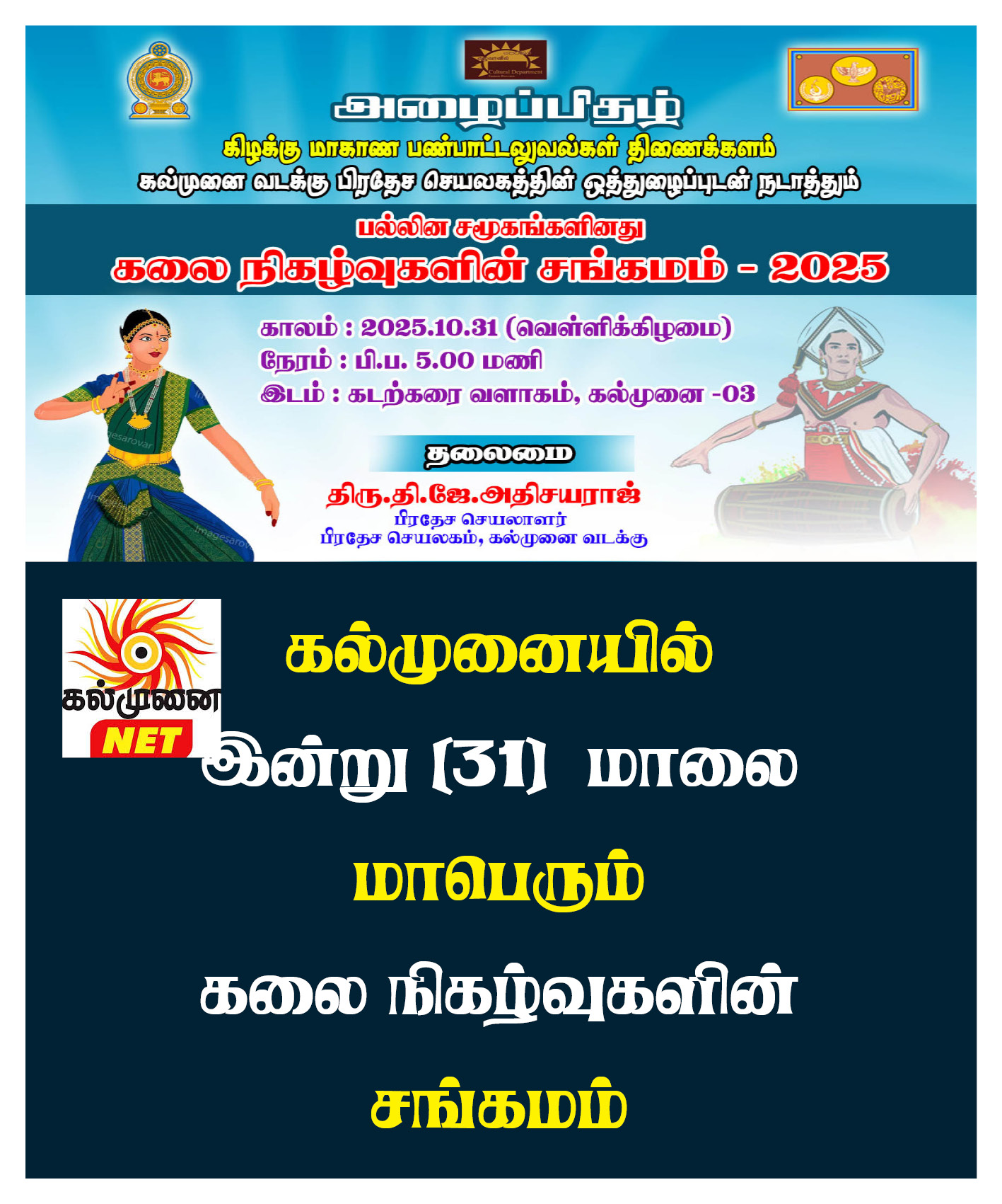 கிழக்கு மாகாண பண்பாட்டலுவல்கள் திணைக்களத்தின் ஏற்பாட்டில் கல்முனை வடக்கு பிரதேச செயலகத்தின் ஒத்துழைப்புடன் கல்முனையில் பல்லின சமூகங்களின் கலை நிகழ்வுகளின் சங்கமம் இன்று 31.10.2025 வெள்ளிக்கிழமை மாலை 5.00 மணிக்கு கல்முனை – 03 கடற்கரை வளாகத்தில் பிரமாண்டமாக நடைபெறவுள்ளது.