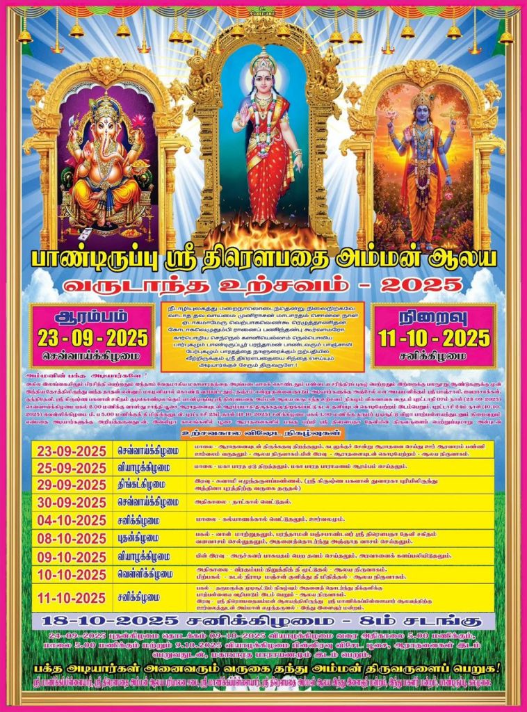 10.10.2025 வெள்ளிக்கிழமை மாலை தீமிதிப்பு வைபவம் இடம் பெற்று மறு நாள் 11.10.2025 சனிக்கிழமை பாற்பள்ளையத்துடன் உற்சவம் இனிதே நிறைவு பெறும்.