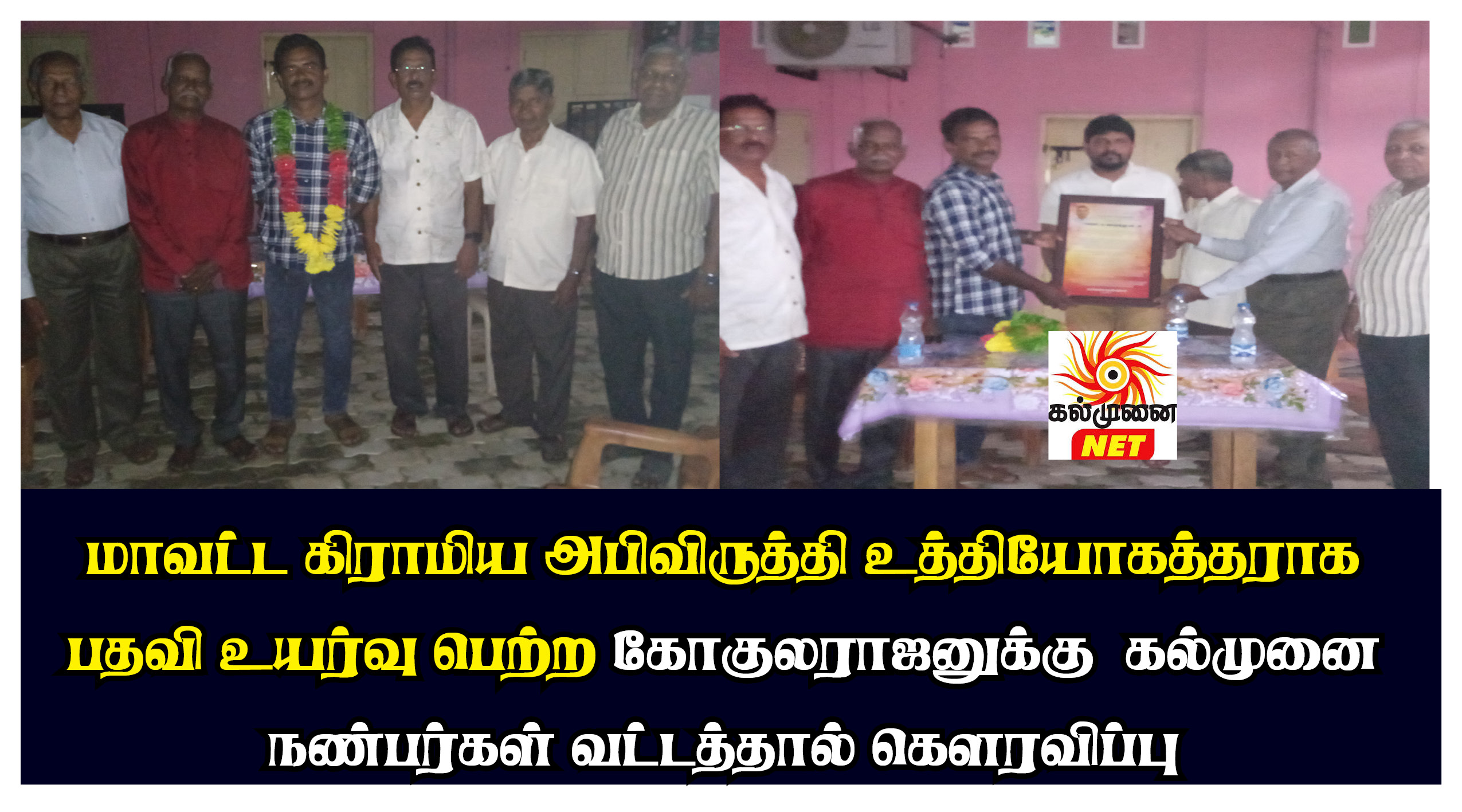 கல்முனை நண்பர்கள் வட்டத்தின் ஏற்பாட்டில் மட்டக்களப்பு மாவட்ட கிராமிய அபிவிருத்தி உத்தியோகத்தராக பதவி உயர்வு பெற்று சென்ற பாலரெட்ணம் கோகுலராஜன் அவர்களை பாராட்டி கௌரவிக்கும் நிகழ்வு கல்முனை நண்பர்கள் வட்டத்தின் தலைவர் எஸ். அரசரெட்டணம் தலைமையில் கல்முனை ‘டிலாணி ரெஸ்ட் இன்’ இல் நேற்று மாலை நடைபெற்றது.
