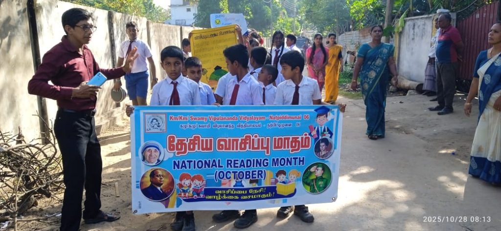 வுhசிப்பு மாதத்தினை முன்னிட்டு விழிப்புணர்வு ஊர்வலமும் கலை நிகழ்ச்சிகளும் கல்முனை மணற்சேனை சுவாமி விபுலாநந்த வித்தியாலயத்தில் 28.10.2025 வித்தியாலய அதிபர் கோ.ஹிரிதரன் பிரதி அதிபர் :- திரு.சரவணமுத்து நவேந்திரன் (விவேகவெளி தமிழேந்திரன்) ஆகியோரின் வழிநடத்தலில் சுவாமி விபுலாநந்த வித்தியாலய விபுலம் ஏற்பாட்டுக் குழுவின் பங்களிப்புடன் சிறப்பாக நடைபெற்றது.