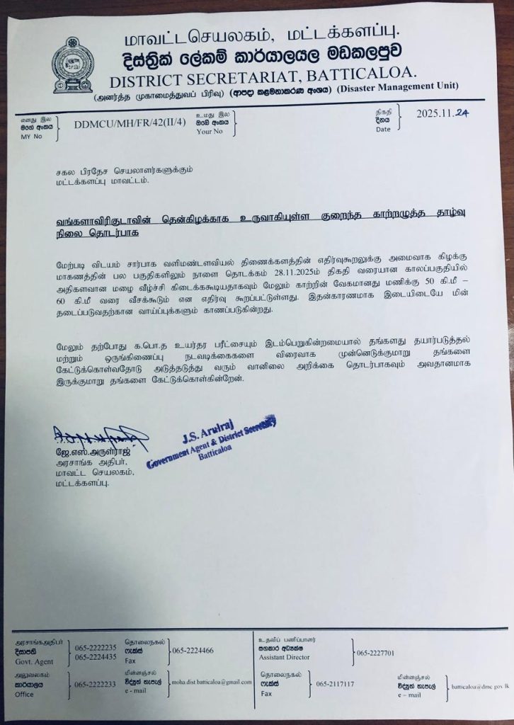 2. நாட்டின் அனைத்து மீனவர்களும் நாளை முதல் (25.11.2025) எதிர்வரும் 30.11.2025 வரை எக்காரணம் கொண்டும் கடலுக்கு செல்ல வேண்டாம்.