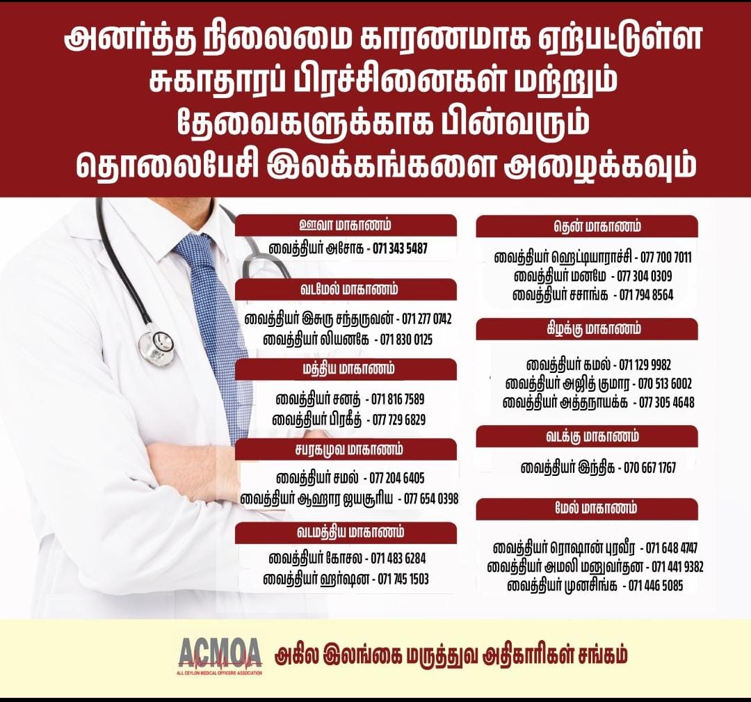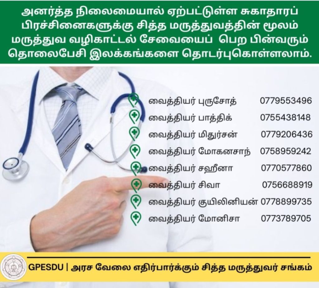 *அனர்த்த நிலைமை காரணமாக ஏற்பட்டுள்ள சுகாதாரப் பிரச்சனைகளுக்கு சித்த மருத்துவமூடான மருத்துவ வழிகாட்டல் ஆலோசனைச் சேவைகளைப் பெற பின்வரும் தொலைபேசி இலக்கங்களை தொடர்புகொள்ளமுடியும்*