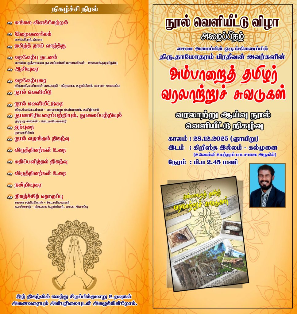தாமோதரம் பிரதீவன் எழுதிய ”அம்பாறைத் தமிழர் வரலாற்றுச் சுவடுகள்” நூல் வெளியீட்டு நிகழ்வு – 28.12.2025