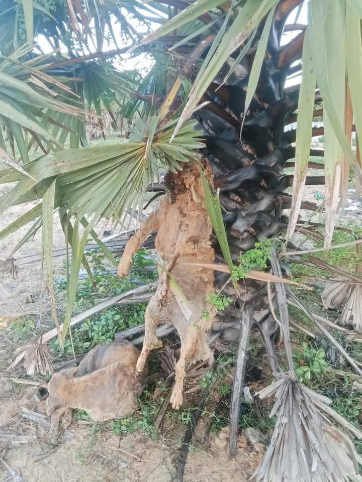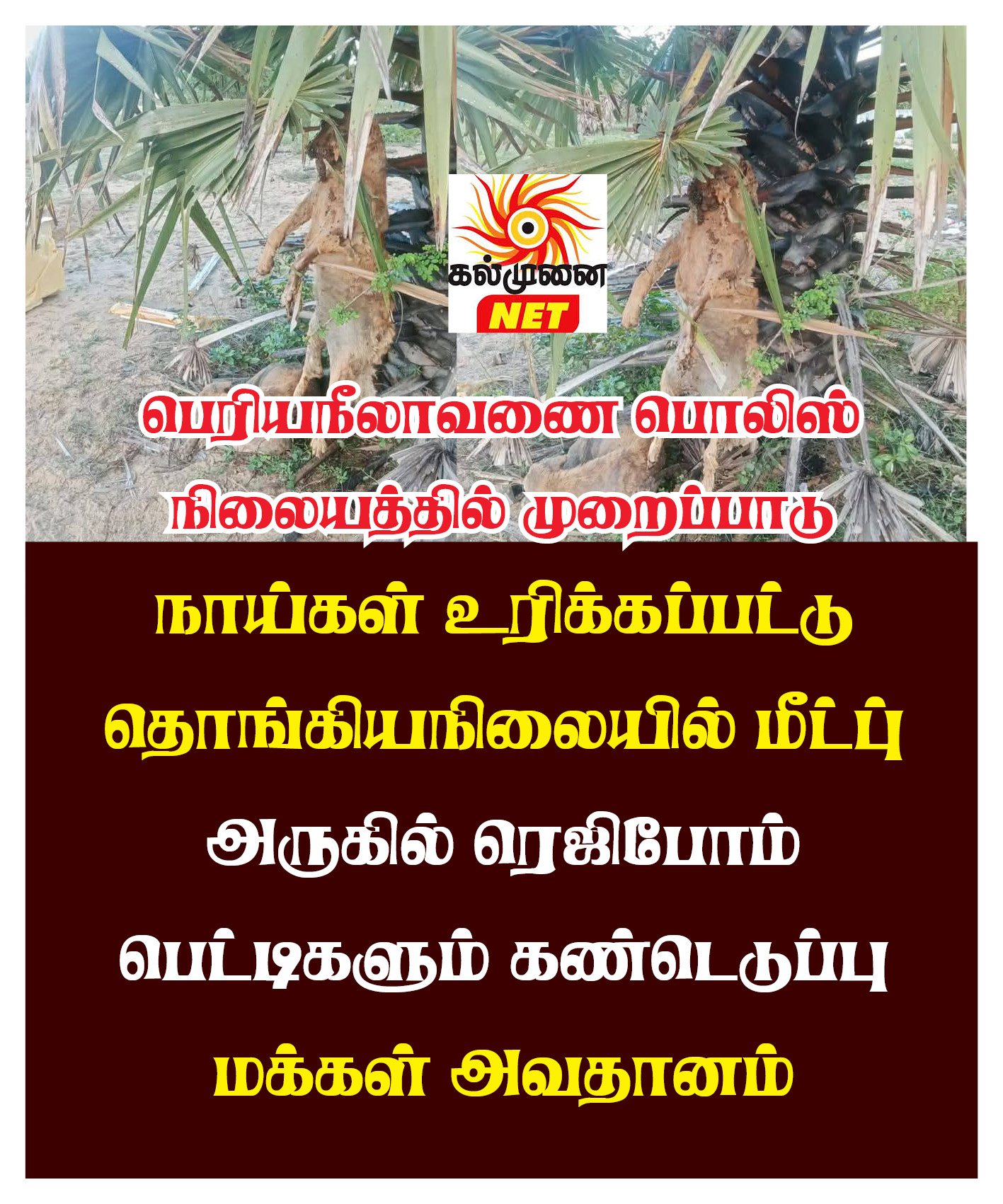 பெரியநீலாவணை விஷ்ணு மகா வித்தியாலயத்தின் மைதானத்தில் நேற்று(31) உள்ள பனைமரம் ஒன்றில். நாய் ஒன்று கொல்லப்பட்டு கட்டி தூக்கப்பட்ட நிலையிலும். மற்றும் ஒரு நாய் இறந்த நிலையிலும் அதன் அருகிலே ரெஜிபோம் பெட்டிகளும் காணப்பட்டது.