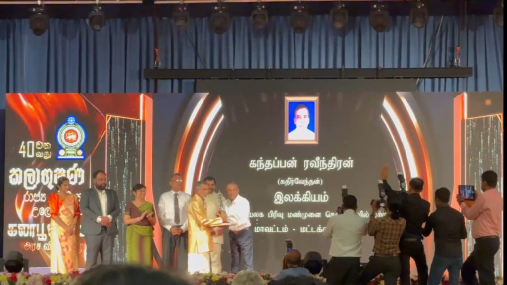 இலங்கை அரசின் உயர் விருதுகளில் ஒன்றான கலாபூஷணம் விருதளிக்கும் நிகழ்வு இன்று 12.01.2026 அலரிமாளிகையில் இடம்பெற்றது. இவ் விழாவில் அம்பாறை மாவட்திலிருந்து இவ்வாண்டு இவ் விருதினைப் பெற்ற ஒரேயொரு தமிழர். பைந்தமிழ்க் குமரன் ஜெயக்கொடி டேவிட்