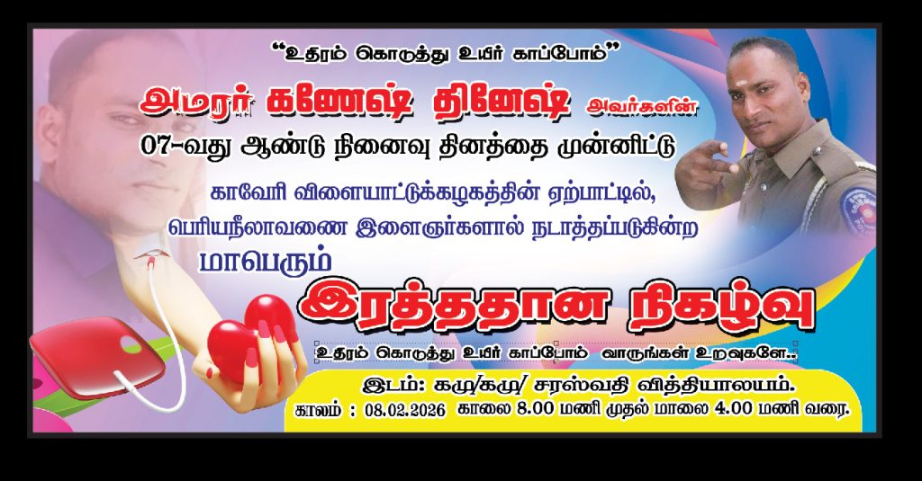 அமர்ர் கணேஸ் தினேஸ் அவர்களின் 7ம் ஆண்டு நினைவாக காவேரி விளையாட்டு கழகத்தின் ஏற்பட்டில் பெரியநீலாவணை இளைஞர்களால் நடாத்தப்படும் மாபெரும் இரத்ததான நிகழ்வு தற்பொழுது ஆரம்பிக்கப்பட்டுள்ளதுஇன்று காலை 08 மணி தொடக்கம் 04 மணி வரை கமு /கமு சரஸ்வதி வித்தியாலய மண்டபத்தில் இன் நிகழ்வு இடம்பெற இருப்பதனால் அனைவரும் “உதிரம் கொடுத்து உயிர் காப்போம் “ என்ற எண்ண கருவுடன் கலந்து எமது பிரதேச இரத்த தட்டுப்பாட்டினை எம்மால் இயன்றளவு தடுப்போம்…….