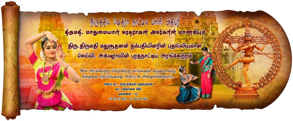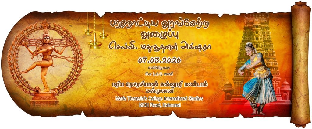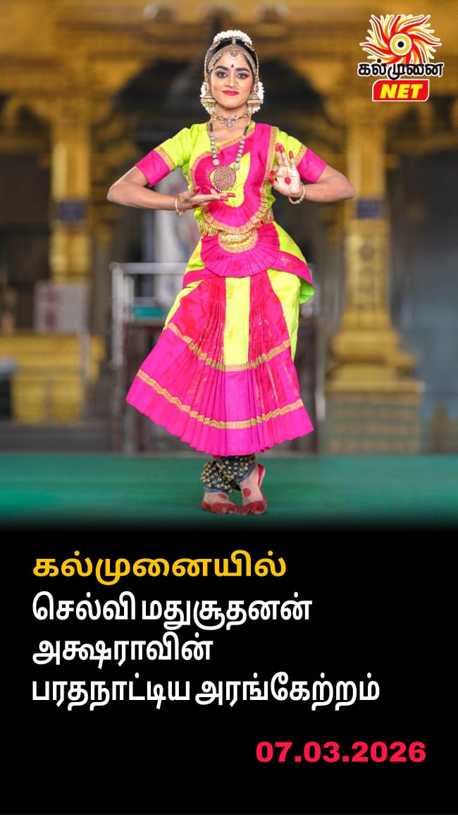 செல்வி மதுசூதனன் அக்ஷராவின் பதரநாட்டிய அரங்கேற்றம் எதிர்வரும் 07.03.2026 ஆம் திகதி பி.ப 1.45 மணிக்கு கல்முனை மரிய தெரேசியாஸ் கல்லூரி மண்டபத்தில் நடைபெறவுள்ளது.
