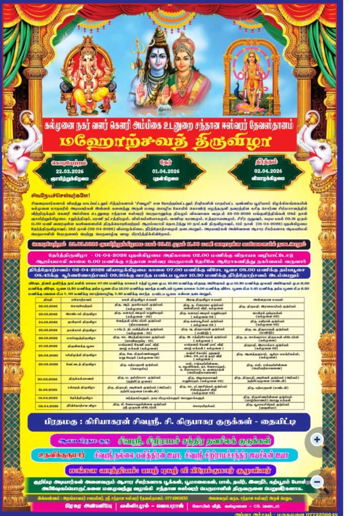 கல்முனை மாநகர் வளர் கெளரி அம்பிகை உடனுறை சந்தான ஈஸ்வரர் தேவஸ்தானத்தின் வருடாந்த மஹோற்சவ கொடியேற்றத் திருவிழா நாளை மறுநாள் (22) ஞாயிற்றுக்கிழமை காலை 9.30 முதல் 11 மணி வரையான சுபமுகூர்த்த வேளையில் நடைபெறவுள்ளது.