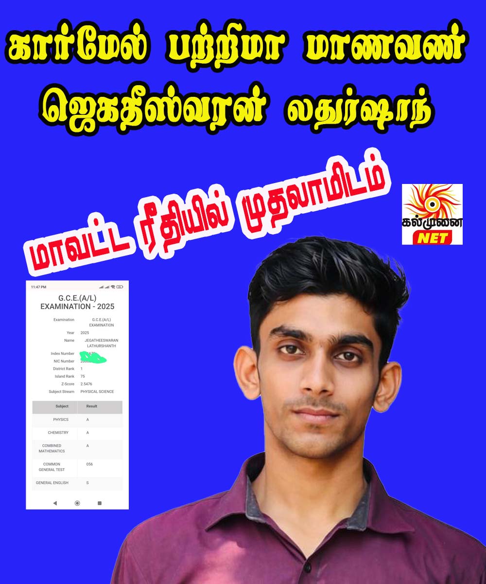 2025(GCE A/L) உயர்தரப்பரீட்சை பெறுபேறுகள் இணையத்தில் வெளியான நிலையில் கார்மேல் பற்றிமா தேசிய பாடசாலையில் கல்வி கற்ற கல்முனையைச் சேர்ந்த ஜெகதீஸ்வரன் லதுர்ஷாந் பௌதீக விஞ்ஞானப்பிரிவில் 3Aசித்திகளைப்பெற்று மாவட்ட ரீதியாக முதலாமிடத்தை பெற்று பாடசாலைக்கும் கல்முனை பிராந்தியத்திற்கும் பெருமை சேர்த்துள்ளார்..அகிலஇலங்கை மட்டத்தில் 75வது இடத்தையும் பெற்றுளார்.
