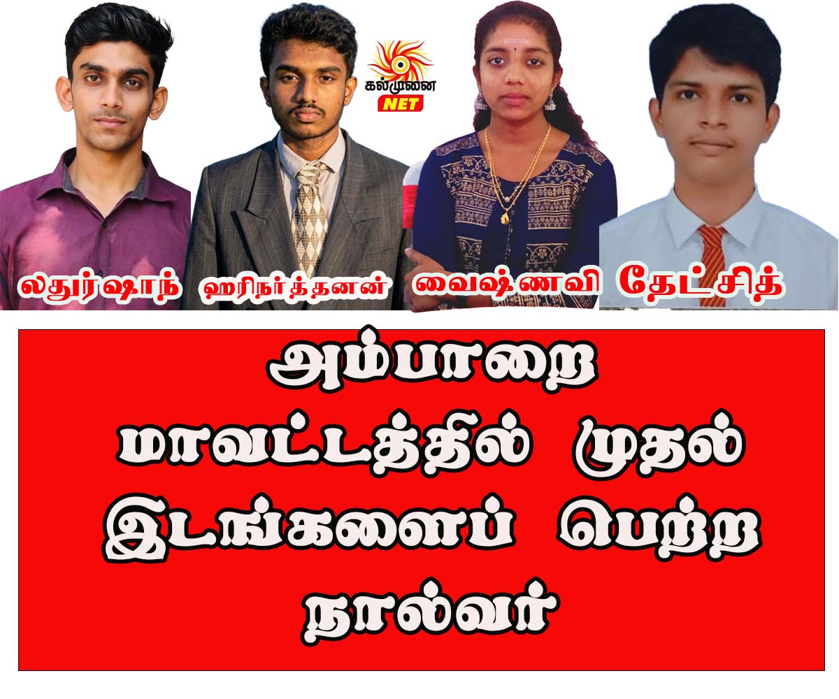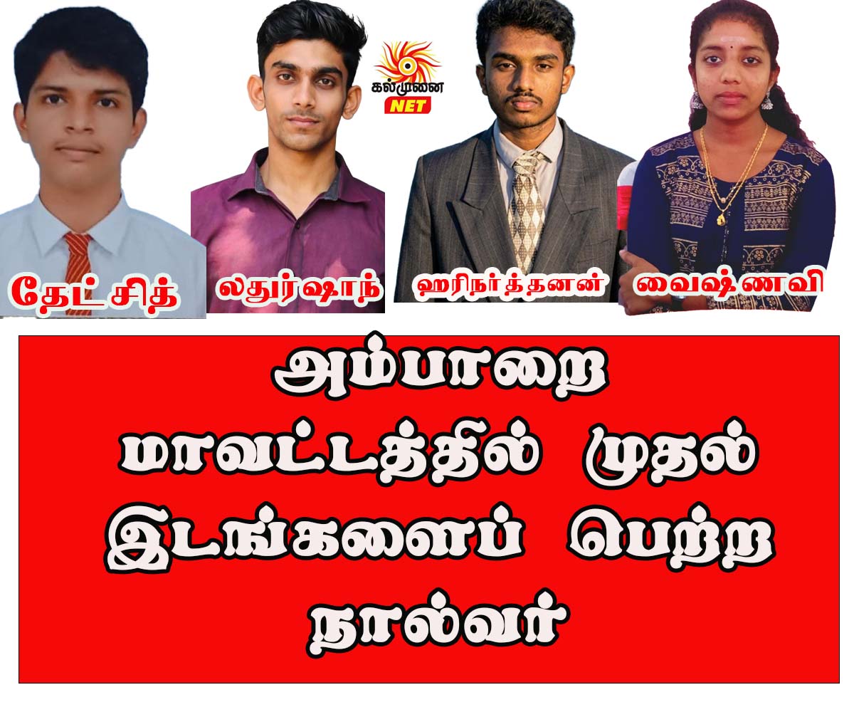 அண்மையில் வெளியான உயர்தர பரீட்சை பெறுபேறுகளின் அடிப்படையில், அம்பாறை மாவட்டத்தில் மருத்துவம், பொறியியல் உள்ளிட்ட நான்கு துறைகளில் முதனிலையில் 04 தமிழ் மாணவர்கள் தெரிவாகி சாதனை படைத்துள்ளனர்.