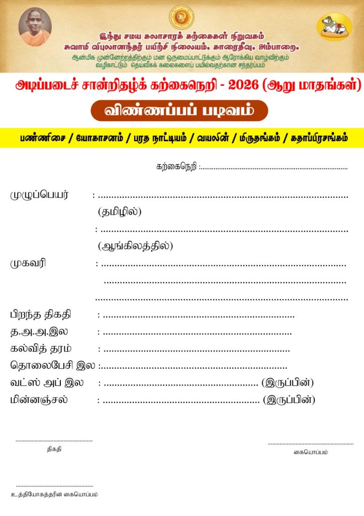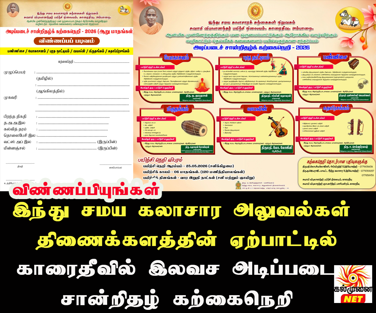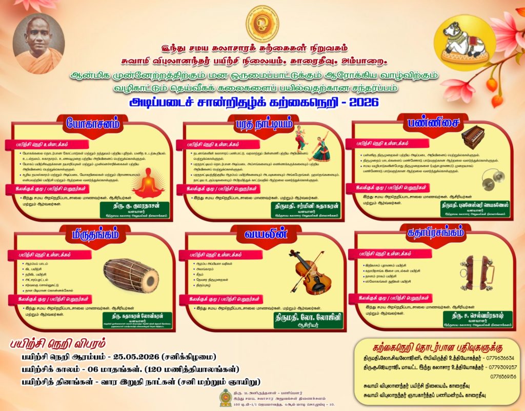 இந்து சமய கலாசார அலுவல்கள் திணைக்களத்தின் ஏற்பாட்டில் அம்பாறை மாவட்டத்தில் அமைந்துள்ள காரைதீவு சுவாமி விபுலானந்தர் பயிற்சி நிலையத்தில், இளைஞர்களின் ஆளுமை மேம்பாடு மற்றும் தொழில்நுட்ப திறன்களை வளர்க்கும் நோக்கில் “அடிப்படைச் சான்றிதழ் கற்கைநெறி – 2026” என்ற சிறப்பு பயிற்சி திட்டத்தை அறிமுகப்படுத்தியுள்ளது.